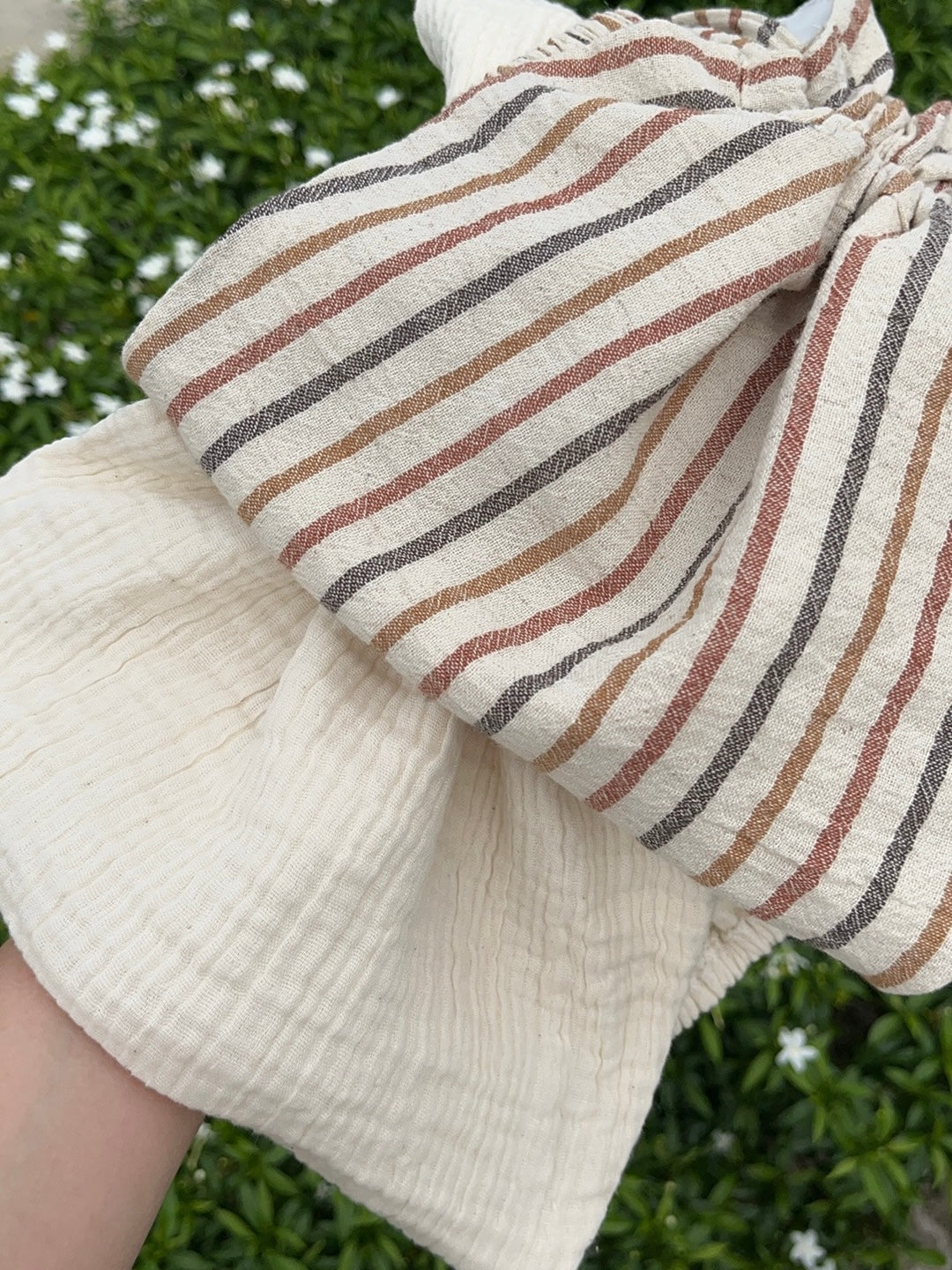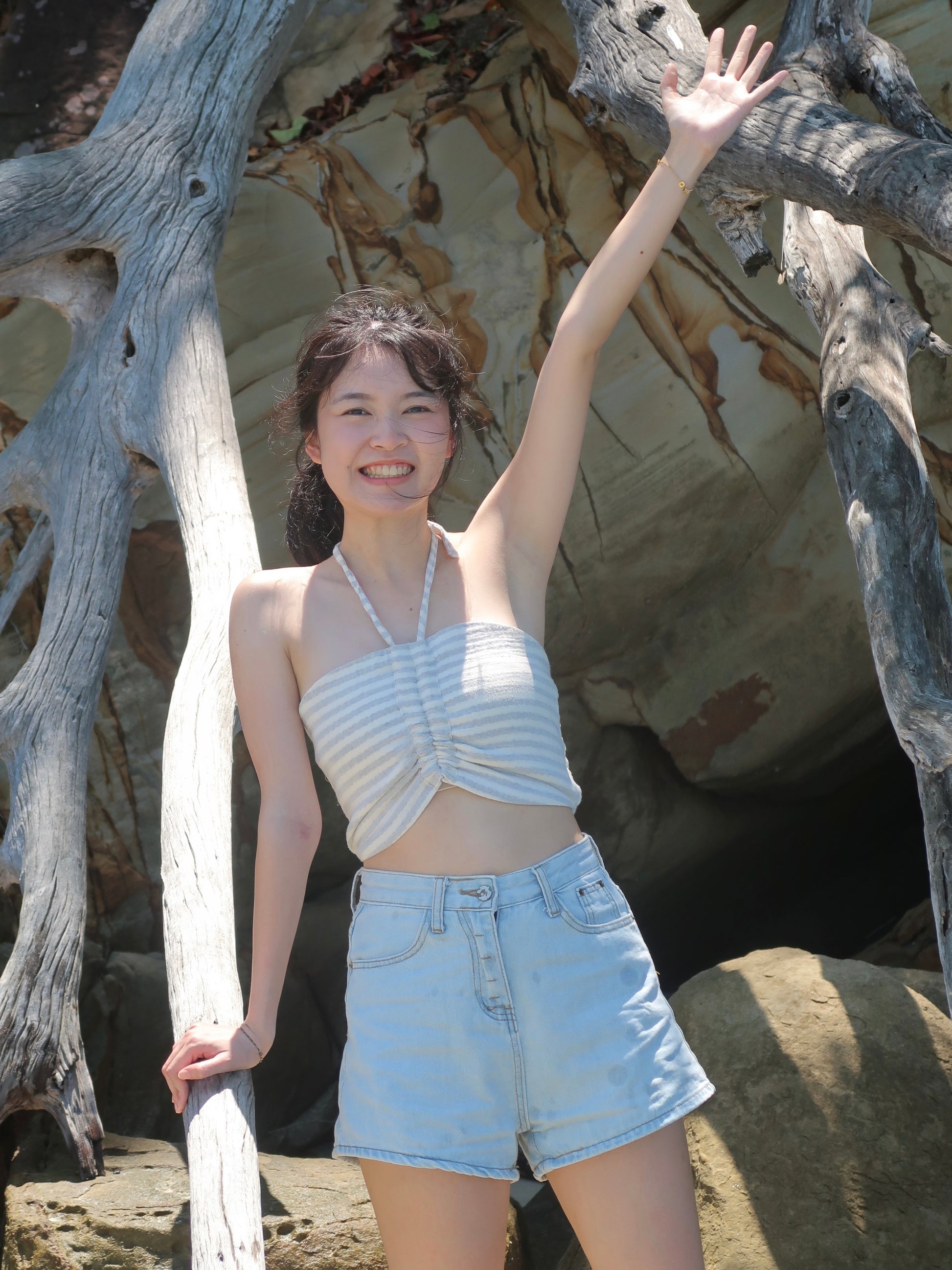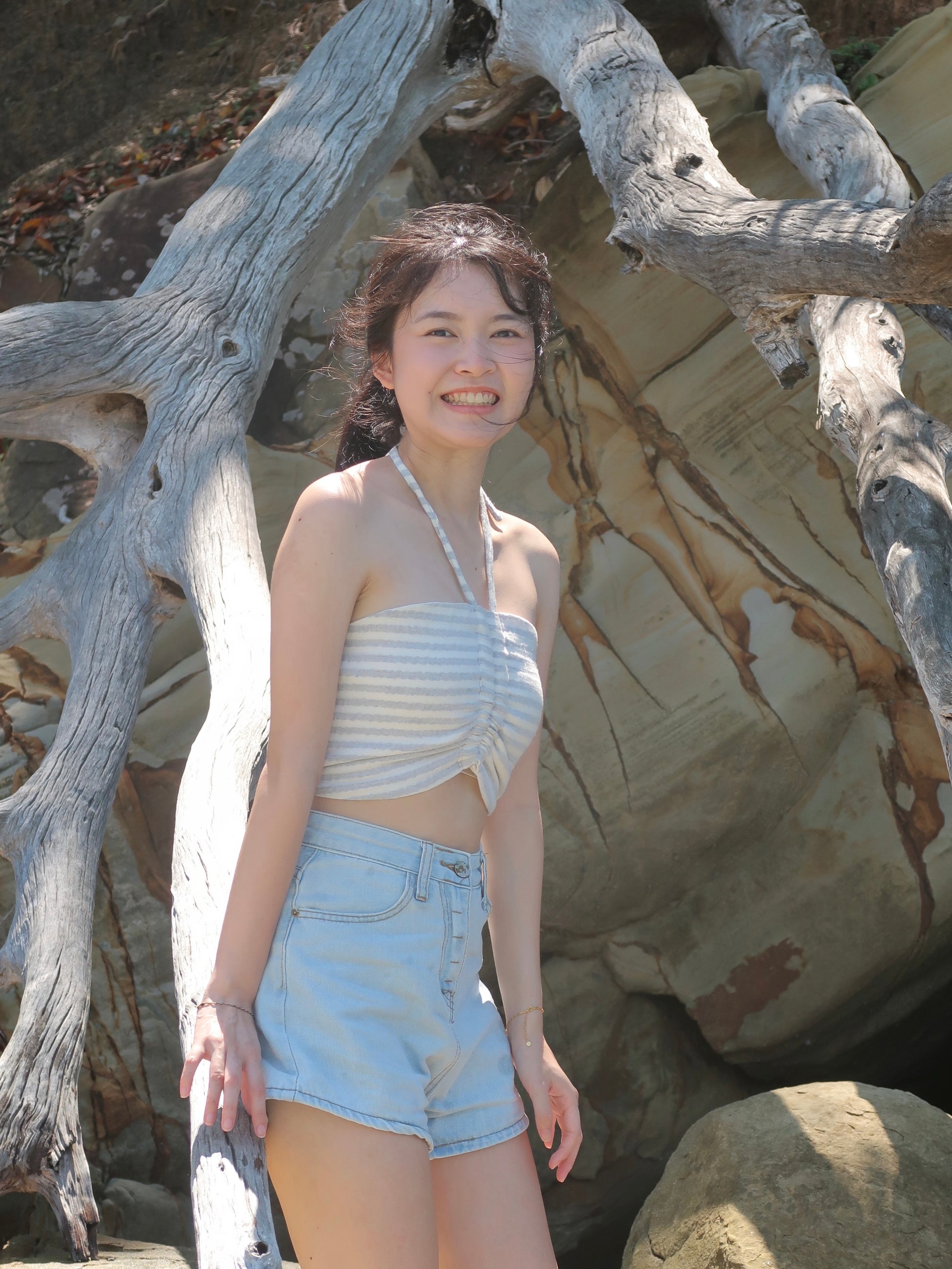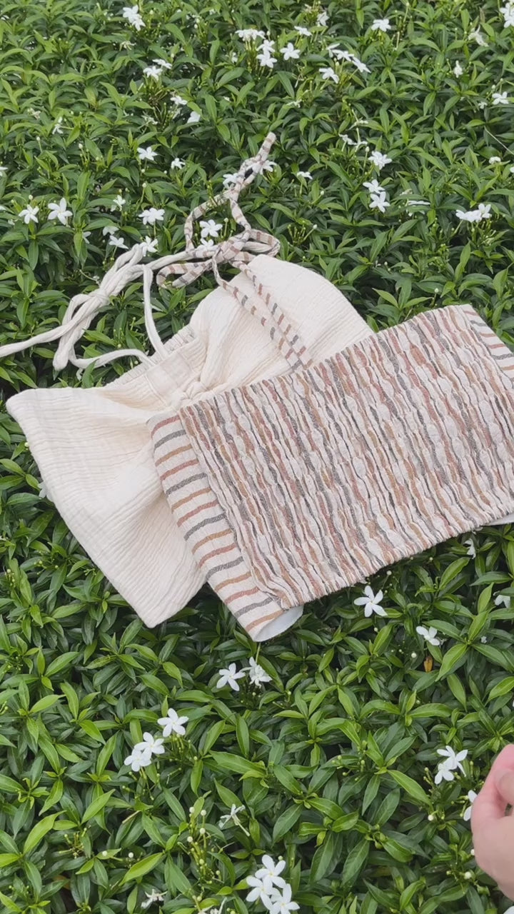 Halter neck top with ribbon behind. Can wear with set (ONLY blue colour available in set) or jeans. Breathable cotton and linen cotton, natural dyes.