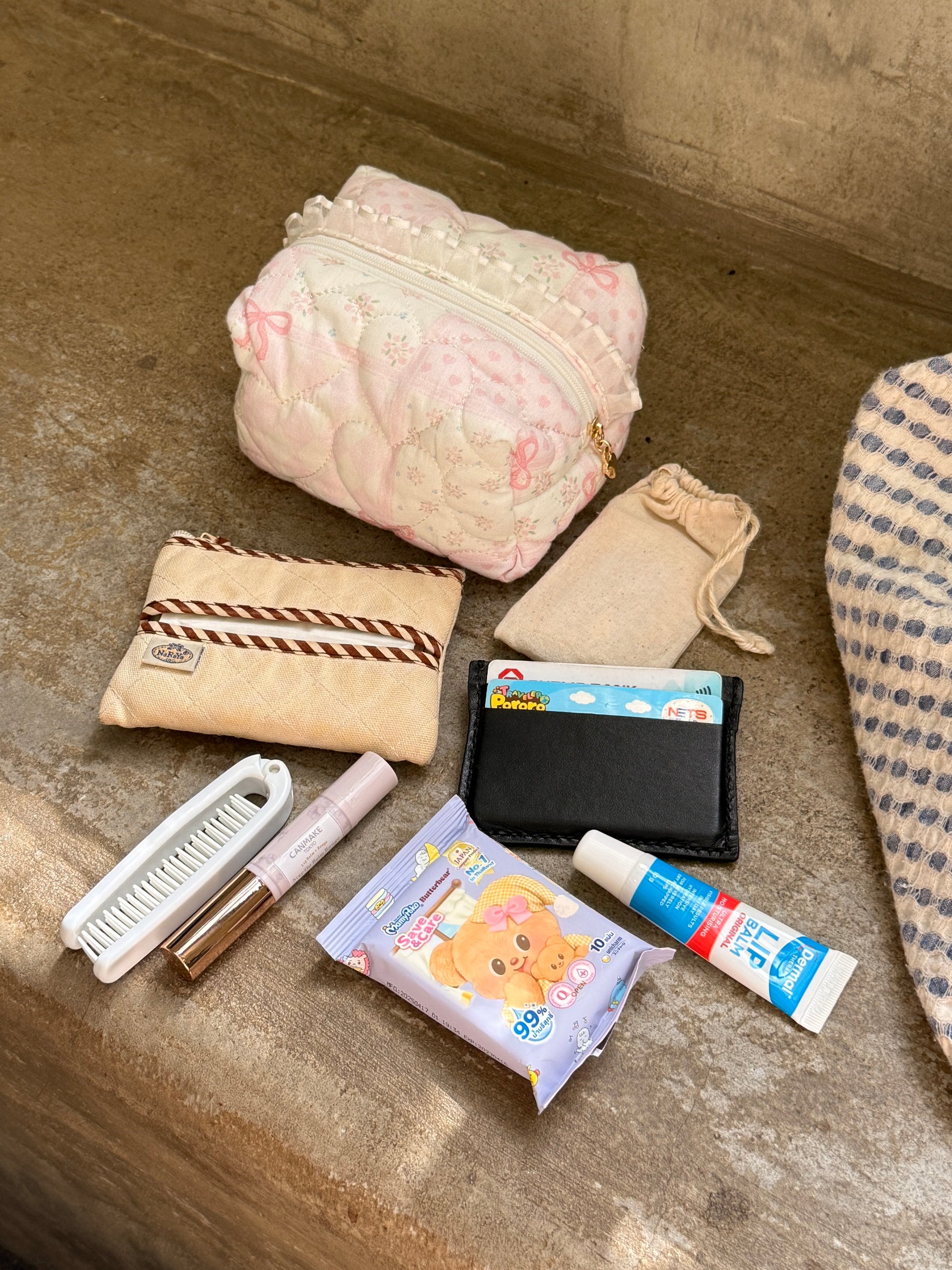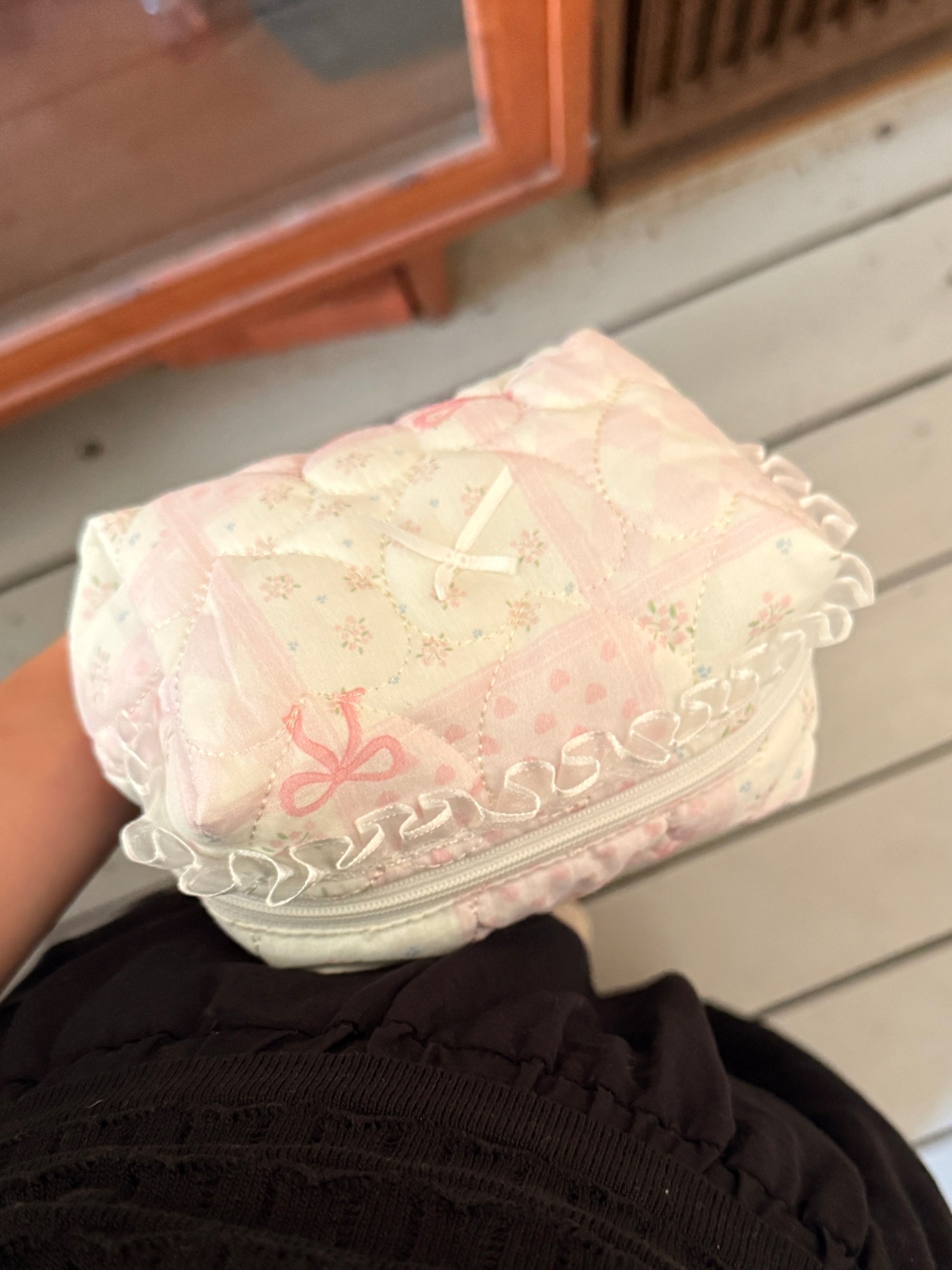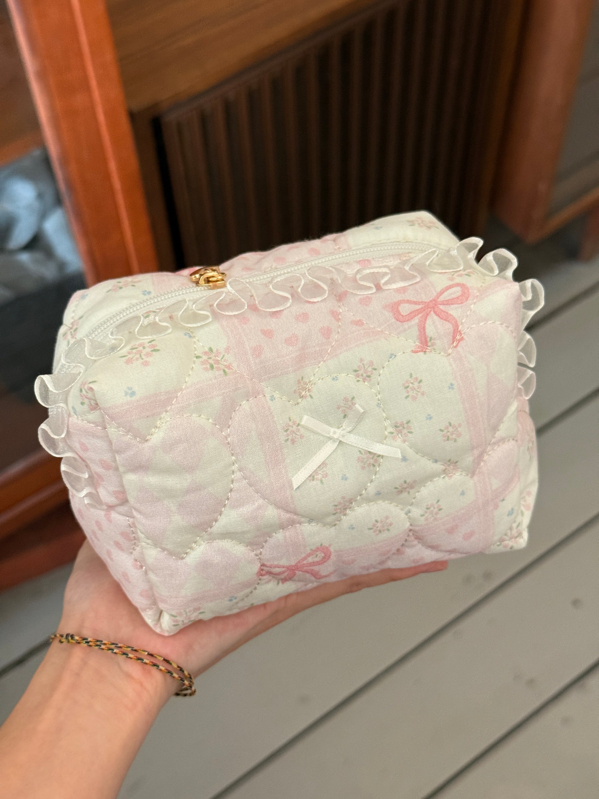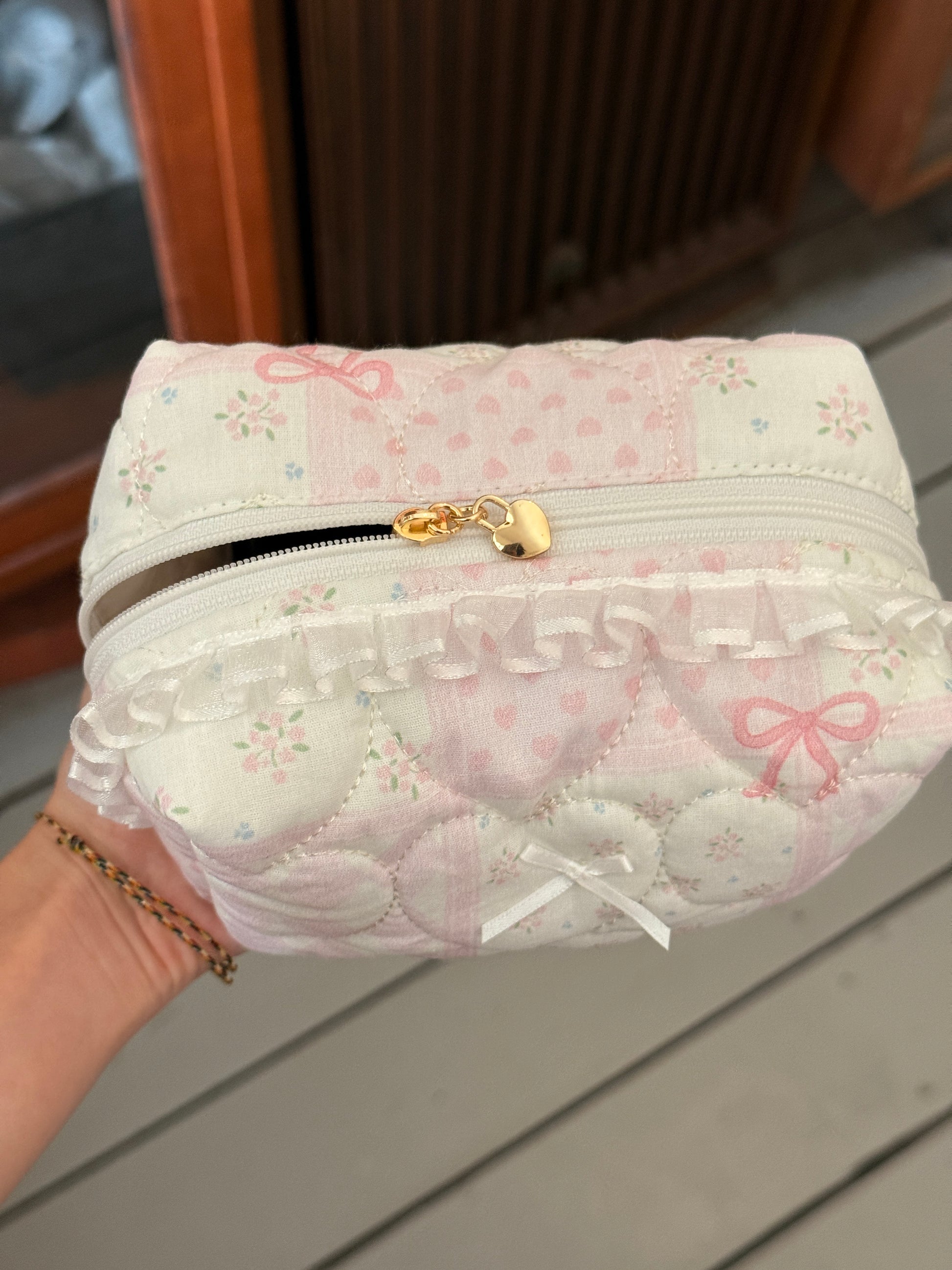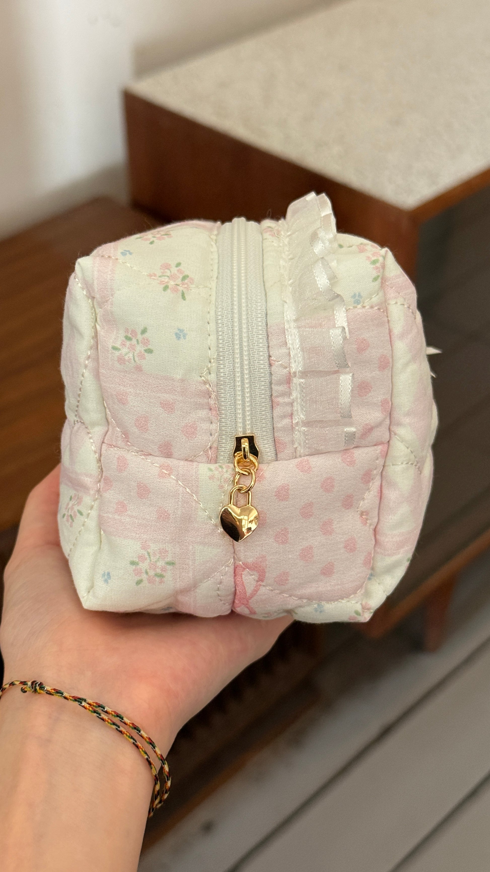Zipper with small gold love. Perfect as an everyday makeup pouch to keep in you bag - it fits tissues, wet wipes, a small mirror, two lipsticks, a mini perfume, and your car keys.