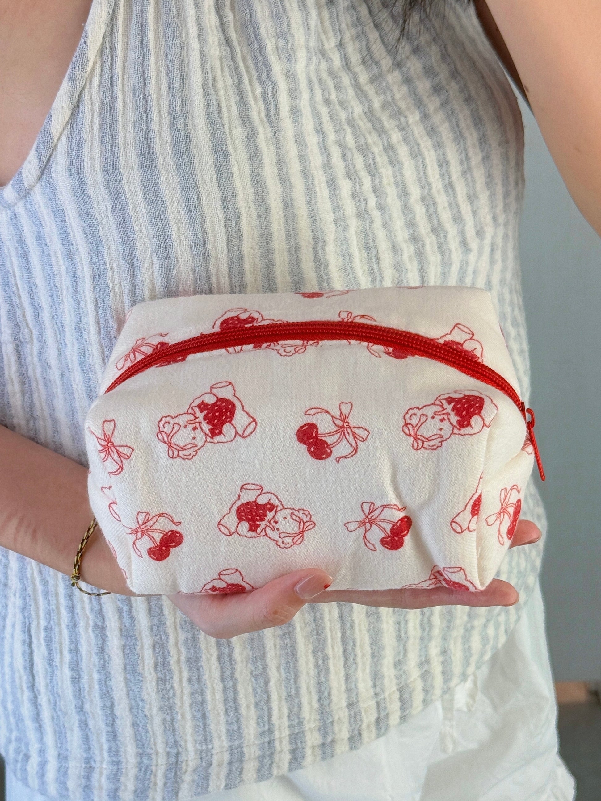 White inner with batting. Can put Camera G7XII, phone stand, and camera charger.