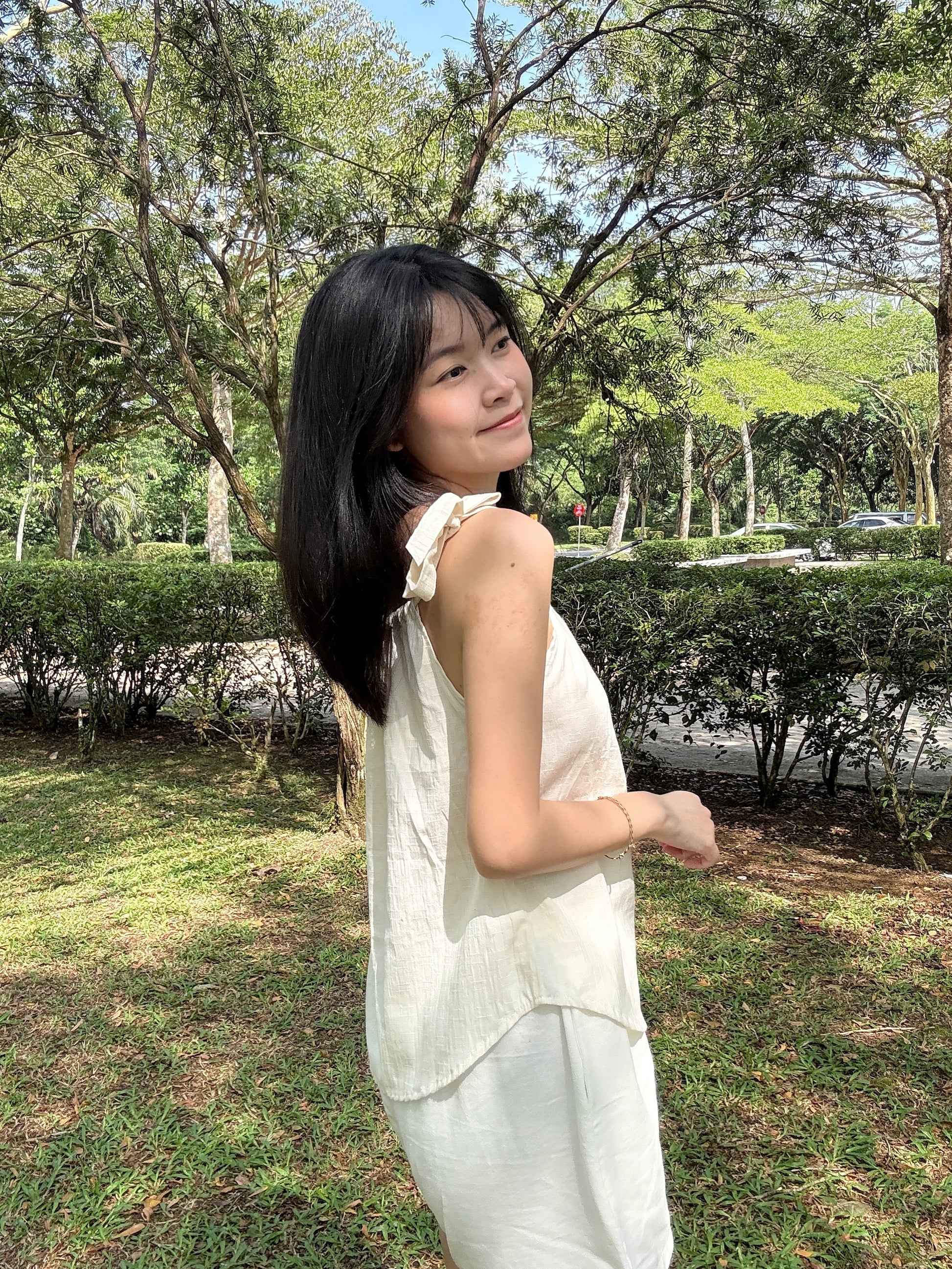 Both shoulder straps are tied into bows by yourself, and the front button row is for design only — they can’t be unbuttoned. Available in one free size and also one color only. Linen cotton fabrics.