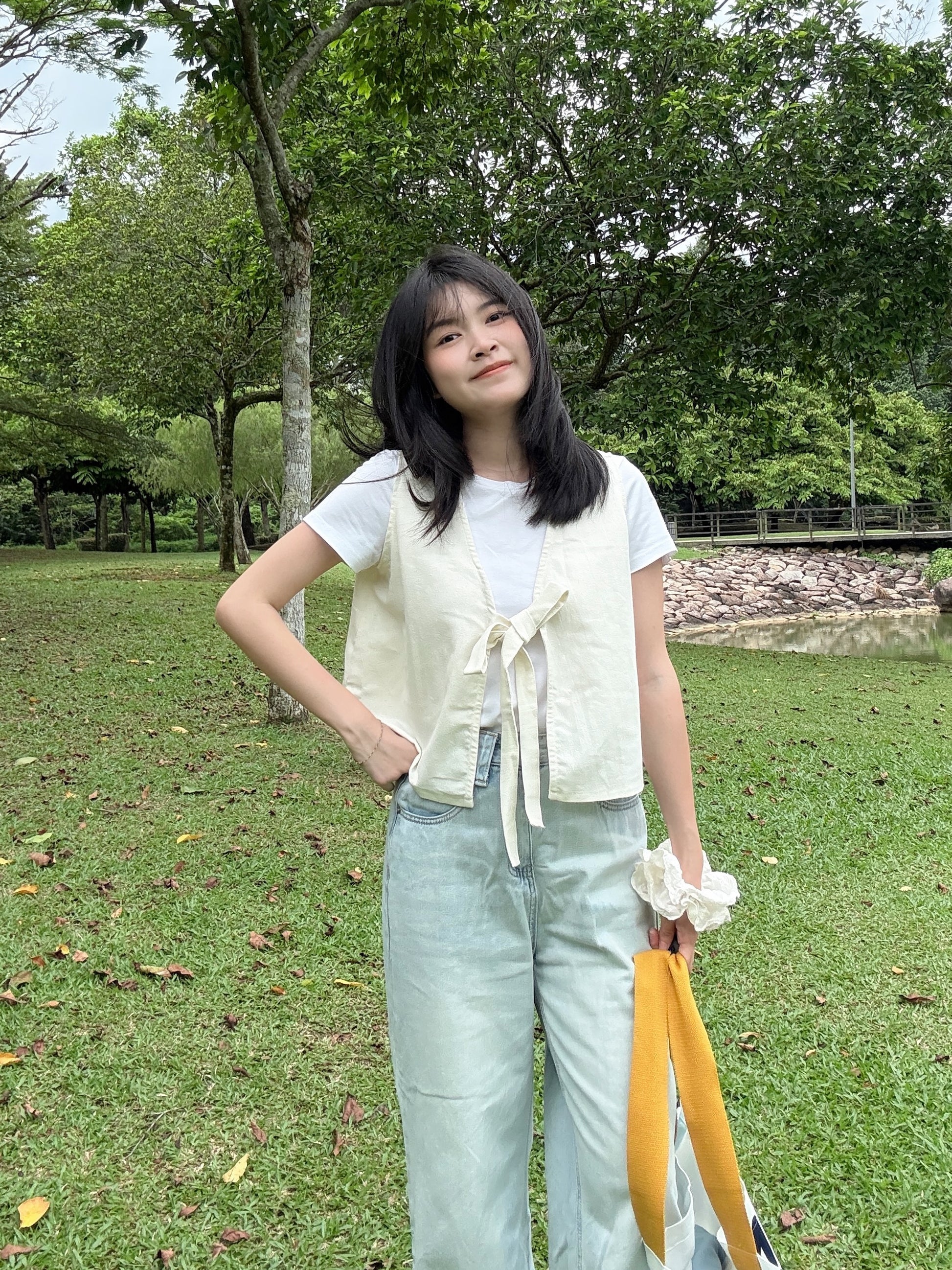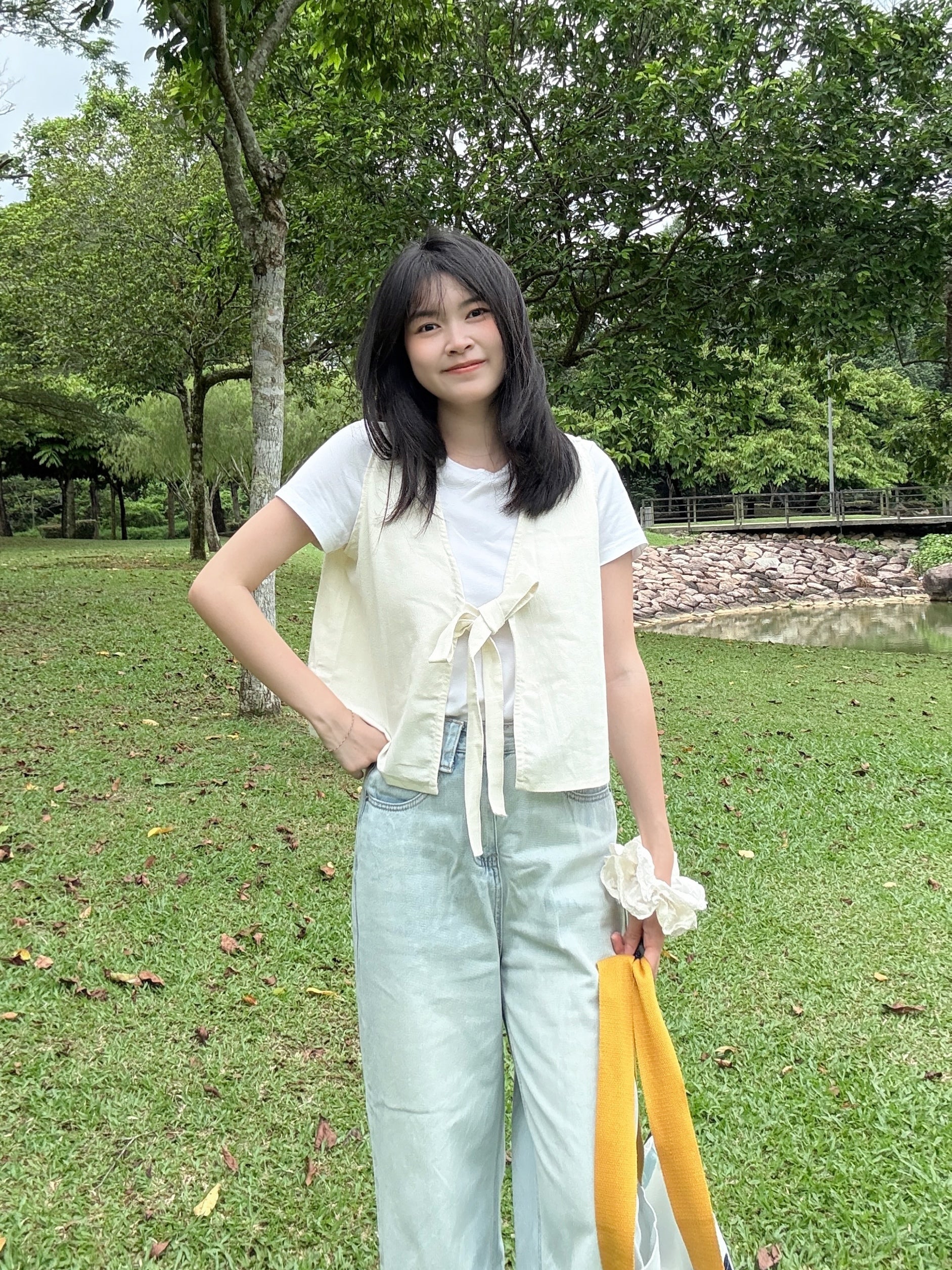 A casual everyday vest made from linen cotton — breathable, soft, and perfect for daily wear. The bow at the front is self-tie, adding a subtle touch of sweetness. It has a relaxed fit that’s great for layering, and the color is super cute too!