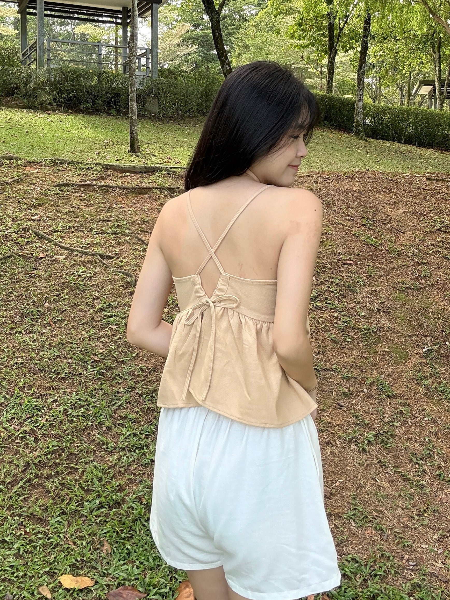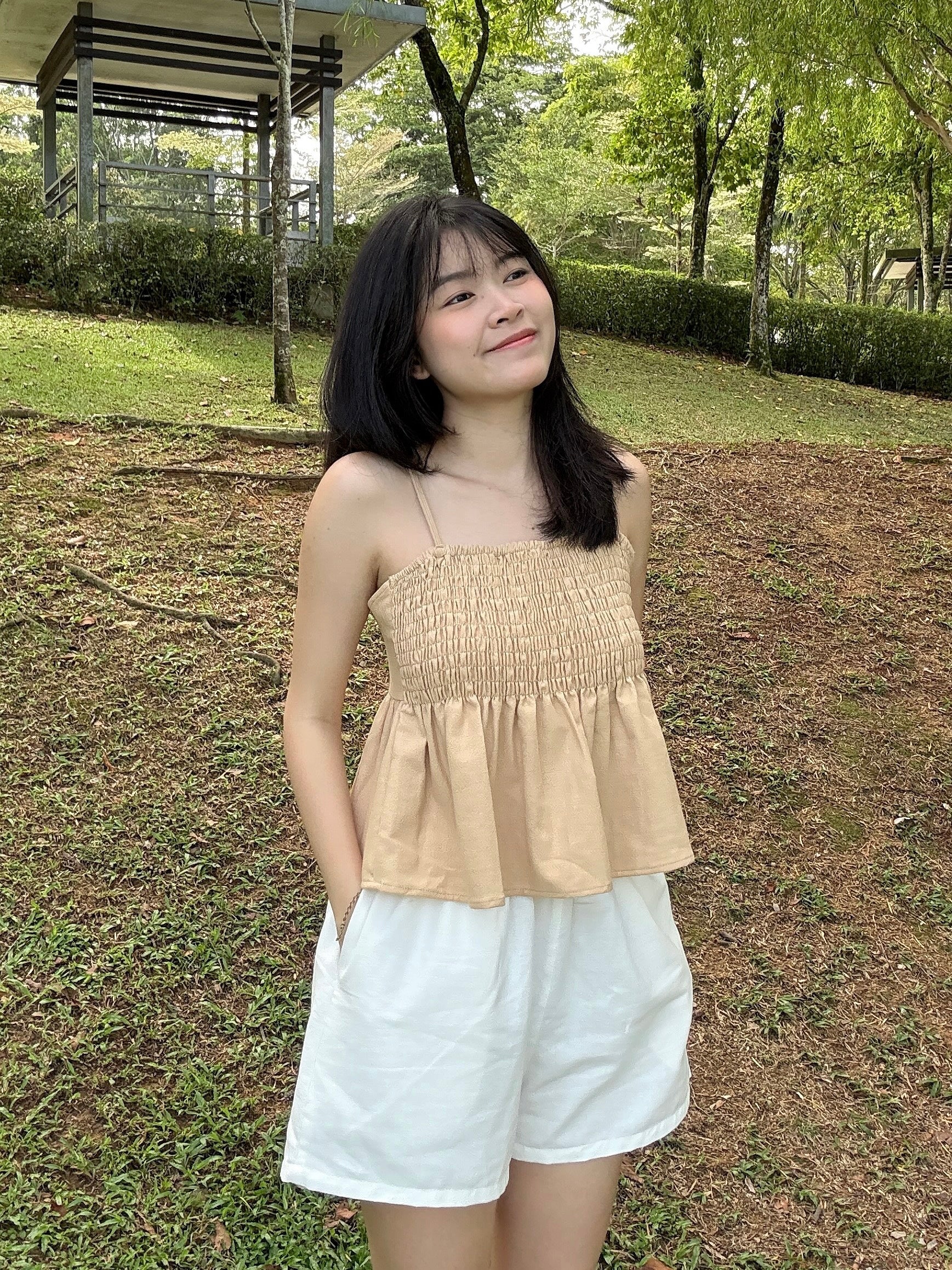 Both shoulder straps are adjustable, and the bust area is very forgiving with a full elastic panel at the front. Cotton fabrics.